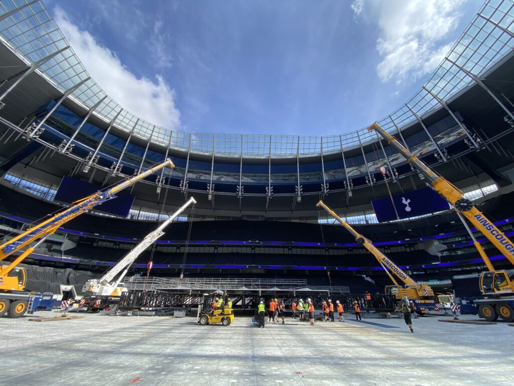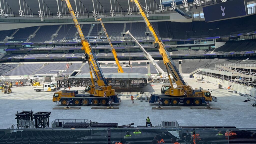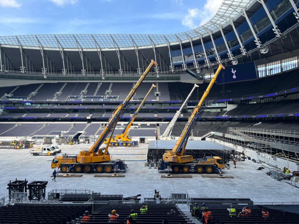 Never done before in the UK: the first use of a four-crane lift to reposition a stadium stage.